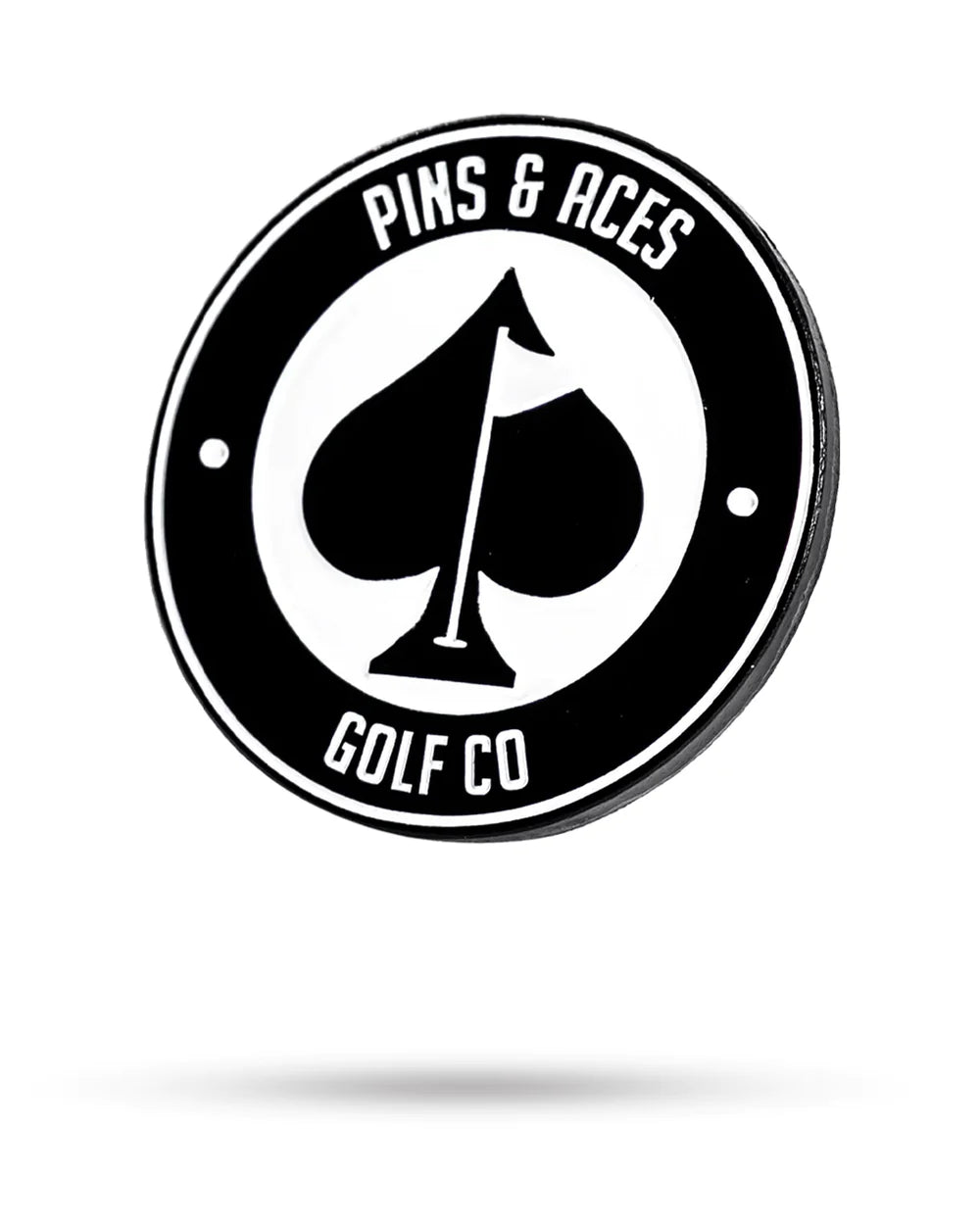 Pins & Aces signature ball markers finally available. Made from cast steel and finished with oven cured enamel, these markers are durable and heavy with a premium feel. Easily attaches to any magnetic surface like a hat clip or divot tool.